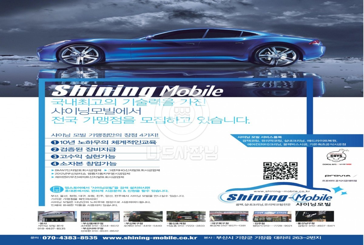 본사정보 상호 샤이닝모빌 대표자 최정민 주소 부산시 기장군 기장읍 대라리 263-2 브랜드정보 업태/업종 서비스 자동차 주력아이템 유리막코팅 가맹점수 11 개 창업비용 1,400 만원 월평균 매출 450 만원 가맹점 평균수익률 85.0 % 가맹점 개설비용 가맹비 100 만원 인테리어(평당) 보증금 로열티 주방설치/집기 기타 총 소요비용 1,400 만원 브랜드 홍보영상