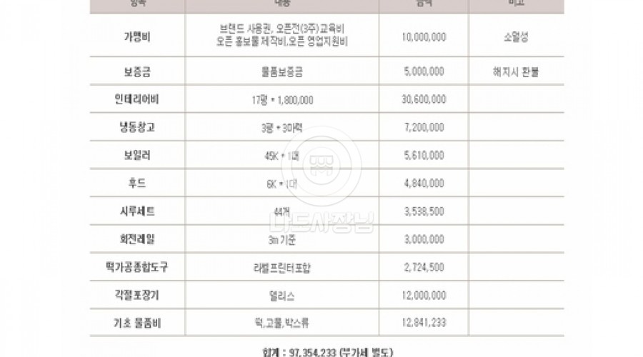 초기 부담금은 가맹비, 교육비, 보증금, 기타비용 합산액 입니다.