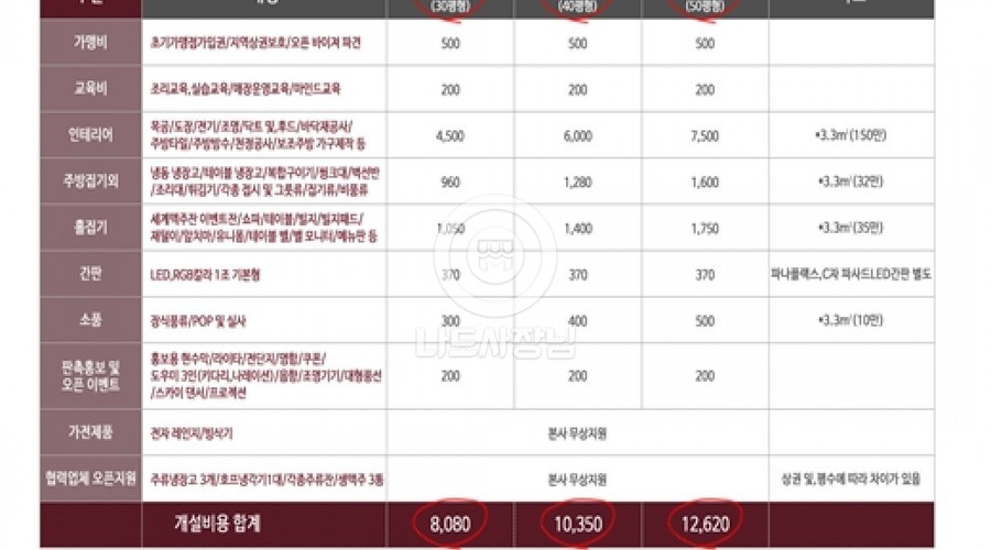 초기 부담금은 가맹비, 교육비, 보증금, 기타비용 합산액 입니다.